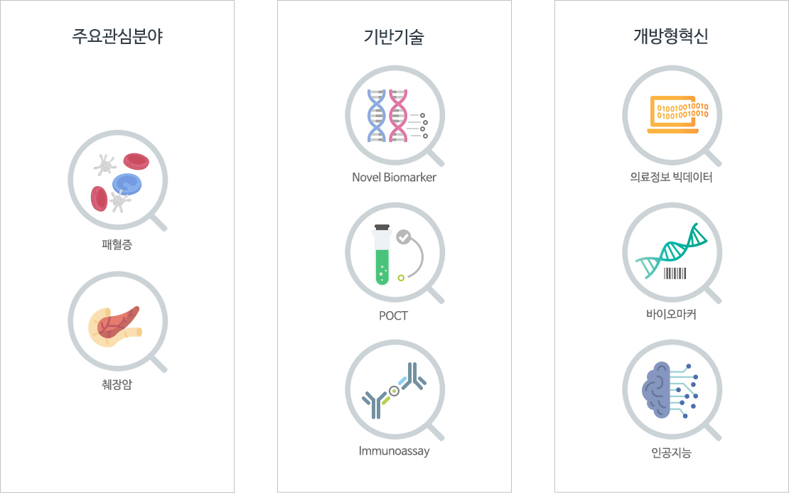 우리는 혁신적 과학기술을 기반으로 첨단 의료기기 개발에 앞장설 뿐 아니라, 질병의 조기 진단, 예후 예측, 및 치료모니터링 등 정밀 진단 시스템을 구축하여 의사와 환자에게 유용한 정보를 제공하고자 합니다.